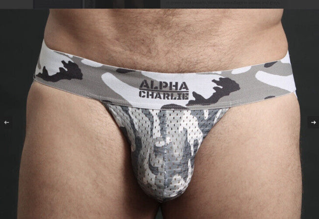Report for duty in Alpha Charlie's army camo jock strap. Featuring a wide and sturdy waistband and breathable woven light mesh pouch, this jock is full camo, band and pouch.