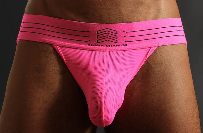 No camouflage or blending in here, be sure you're seen by slipping on one of our latest jockstraps from Alpha Charlie. The Neon Jock will ensure you're the target of all affection - whether it's in the backroom on the dance floor of your favorite underwear party. It comes in very bright blue, lime-green, hot-pink and lemon-yellow.