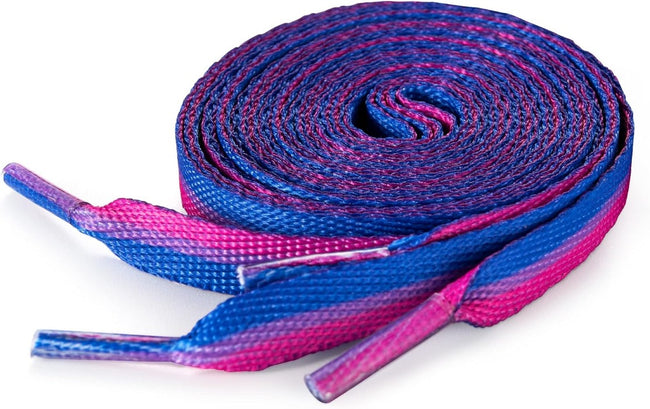 Bright and colourful flat style shoelaces to show your pride as well as making your footwear pop. Bisexual pride flag print throughout. Made with hard wearing polyester. Sealed coated ends.