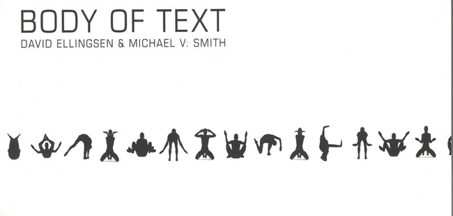 Poetry. Photography. Performance. BODY OF TEXT is a collection of concrete poems made by marrying poetry with body-based performance art and documentary photography. Dressed in a full black body-suit, Michael V. Smith is photographed by David Ellingsen in hundreds of poses which resemble Greco-Roman letters, Asian characters, hieroglyphs, or Rorschach inkblots. These are then arranged in book form, to a maximum of three images per page. In the same spirit of moving beyond language as heard in the sound poetry of Christian Bok the poems in BODY OF TEXT occupy a liminal space between poetry and visual art. The body is made word, is made site, object and subject. The body is symbol.