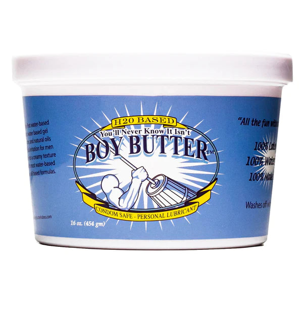Boy Butter H20 Formula is our water-based cream formula with Vitamin E and Shea Butter whipped into an organic creamy lubricant that is safe to use on any body or toy. It feels silky smooth and never sticky. Boy Butter H20 is Long Lasting, gentle, washable, and eventually absorbs into the skin, It can even be used as moisturizer or lotion.