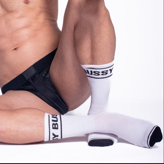 Make a bold statement with these eye-catching socks featuring a crisp white base, striking black accents on the toe and ankle, and the daring "Bussy" logo across the band. The iconic Prowler paw print on the sole adds an authentic signature touch.