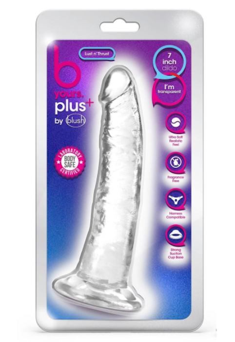 Blush B Yours Plus Lust n’ Thrust is a 7.5inch realistic dildo with a slight curve for G-spot and P-spot stimulation, and a sturdy suction cup base that holds to any smooth flat surface for solo time. Or partner up for strap-on harness fun! Lust n’ Thrust has a tapered head for easy insertion and is transparent for optimal viewing during play.