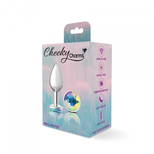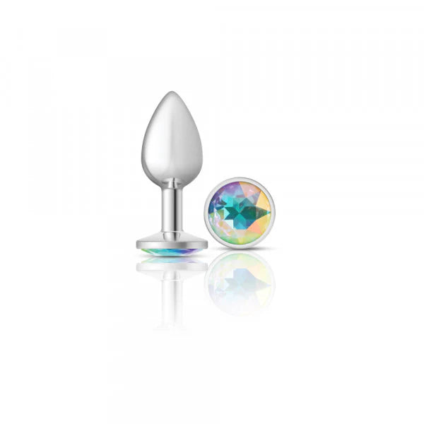 Small, silver metal, teardrop shaped anal plug with sparkling clear iridescent colored, round acrylic gemstone. Hypoallergenic, nonporous, body safe, nickel free, aluminum alloy, anal jewelry compatible with all lubricants. Easy to clean and dishwasher safe butt plugs.