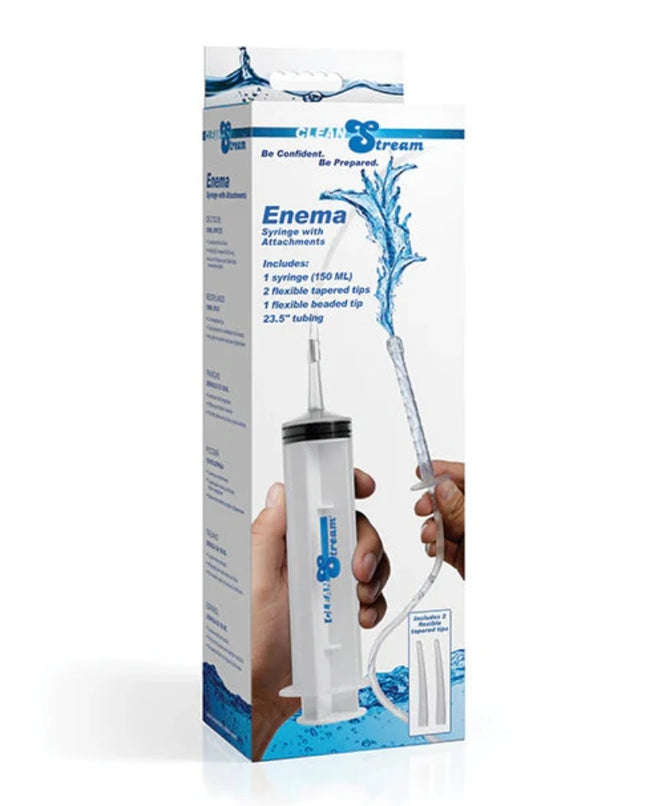 The syringe holds up to 150ml of fluid or lubricant, so enjoy keeping an eye on how much it takes to fill you up! The separation of pieces also keeps things cleaner; only the tips are inserted in your derriere, meaning that the contents in the syringe are not contaminated. To clean, wash with warm water and mild soap, then rinse it and pat dry. It can also be soaked in warm, soapy water to get into the tubing.