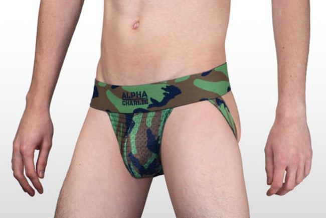 Report for duty in Alpha Charlie's army camo jock strap. Featuring a wide and sturdy waistband and breathable woven light mesh pouch, this jock is full camo, band and pouch.