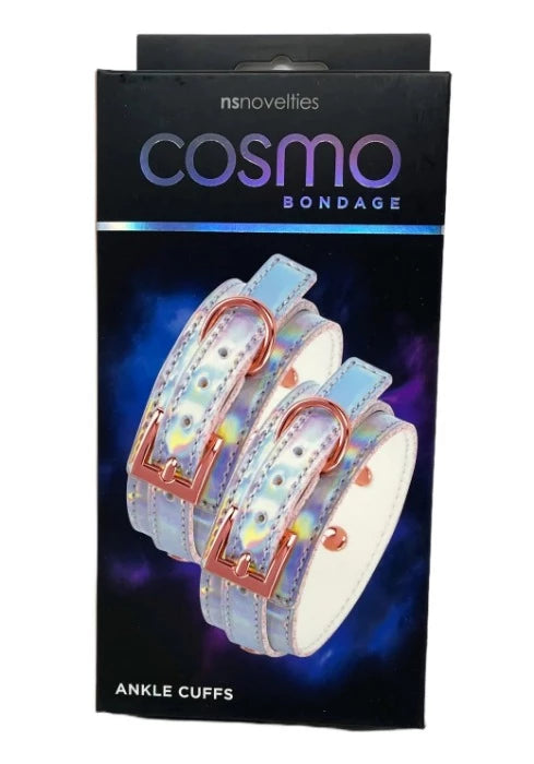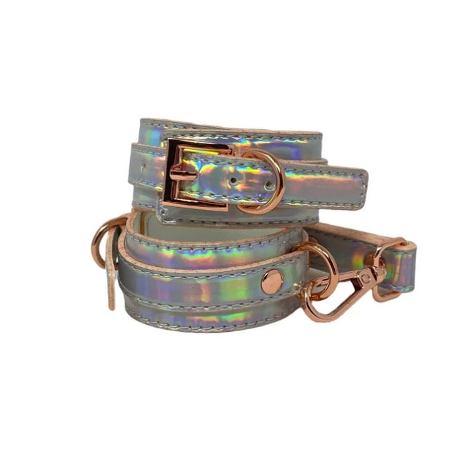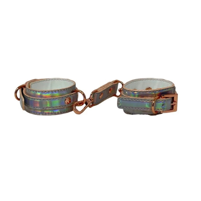 Light up the night with Cosmo's holographic restraints. Accented with Rose Gold nickel-free hardware and fully adjustable for universal fit.