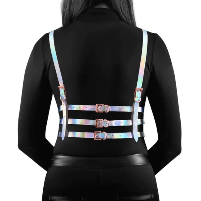 Dress up your assets with Cosmo’s stylish chest harness. Accented with rose gold nickel-free hardware and adjustable straps for the perfect fit. Made from easy to clean vinyl.