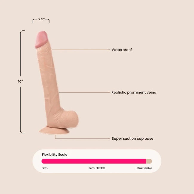 Crafted with body-safe Phthalates-free material DICKBOY Ten ballsy dildo stands 10" (25 cm) tall, is insertable up to 8.5" and has a beefy 6" girth (2" diameter) always ready to fill you up for a deep satisfying climax.