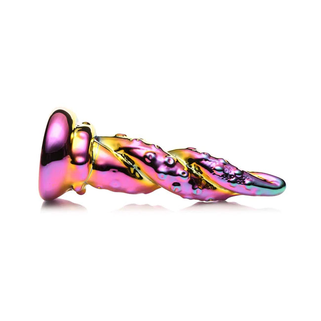 Transform your sex toy collection with phenomenal additions from Creature Cocks! This Kraken dildo has an iridescent, metallic, rainbow of colors featuring bright pink and yellow gold! It is made out of a firm, super smooth borosilicate glass. This kind of glass is the same that you often find in kitchenware and is not only durable and high quality, it also can handle temperature changes so you can enjoy warming it up or cooling it down before insertion! The tip is tapered to make insertion easier and it gradually widens towards the base.