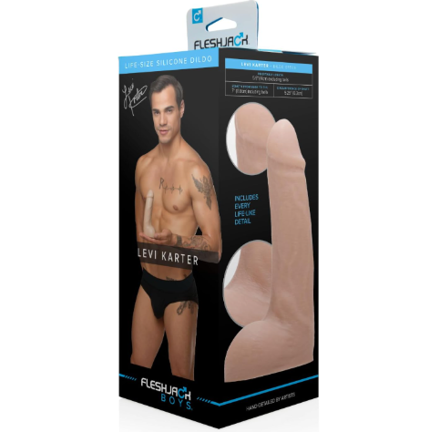 You'll never need to leave home again! Molded from Levi's own cock, his dildo will keep you satisfied whenever the need arises. Made with the highest quality, platinum cured silicone. Length from base to tip: 7" including balls. Insertable length: 5.5" excluding balls. Circumference at base of shaft: 5.25".