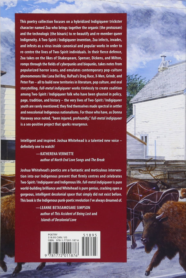 This poetry collection focuses on a hybridized Indigiqueer trickster character named Zoa who brings together the organic (the protozoan) and the technologic (the binaric) to re-beautify re-member queer Indigeneity. A Two-Spirit/Indigiqueer invention, Zoa infects, invades, and infests as a virus inside canonical and popular works in order to re-centre the lives of Two-Spirit individuals. In their fierce defence, Zoa takes on the likes of Shakespeare, Spenser, Dickens, and Milton, romps through the fields of cyberpunks and biopunks, takes notes from popularized horror icons, and emulates contemporary pop-culture phenomenons like Lana Del Rey, RuPaul's Drag Race, X-Men, Grindr, and Peter Pan—all to build new territories in literature, pop culture, and oral storytelling. full-metal indigiqueer works tirelessly to create coalition among Two-Spirit/Indigiqueer folk who have been ghosted in policy, page, tradition, and history—the very lives of Two-Spirit/Indigiqueer youth and rarely mentioned; they find themselves made spectral in settler and neocolonial Indigenous nationalisms. For those who have, as Donna Haraway once noted, "been injured, profoundly," full-metal indigiqueer is a sex-positive project that sparks resurgence.