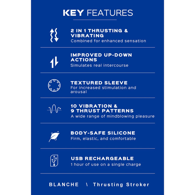 Reaching up to 300 thrusts per minute and a thrusting distance of 4cm, Blanche is one of the most powerful automatic masturbators on the market. And, if that still isn’t enough for you, you can take things to the next level by turning on its vibrating function. With 10 vibrating patterns and 9 thrusting, Blanche changes masturbation forever.