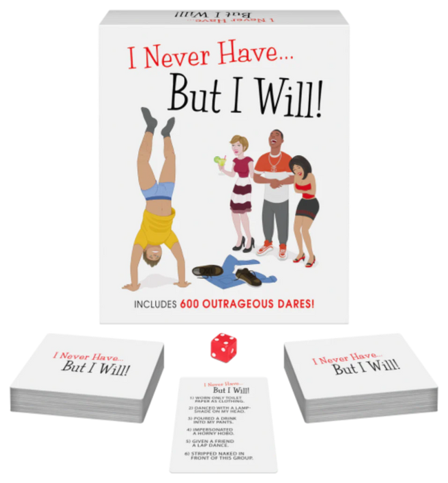 After an I Never Have statement is made, players indicate who of them have never done the action. The first of these players who announces, “But I Will” then acts out the dare and earns the card as a point.