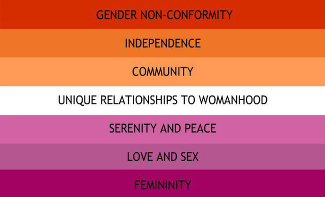 This flag is a new proposed Lesbian flag that has been in circulation lately. This flag has Seven stripes. The top three are shade of Red and Orange, where as the bottom three are shades of Pink, all separated by a White stripe. It sometimes will be seen in a simplified Five stripe design.