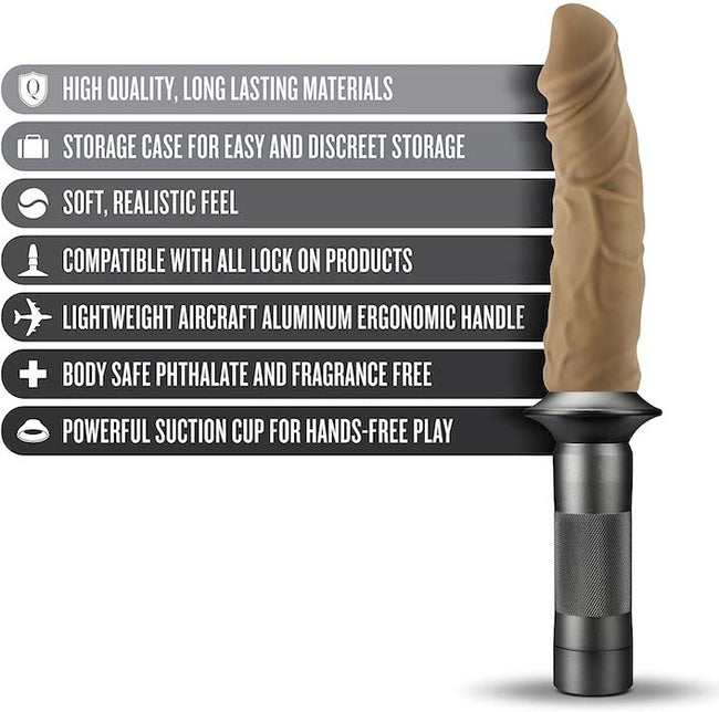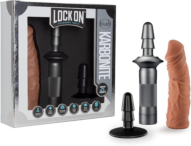 Let your fantasies come to life with the Karbonite Lock On Handle Kit! This powerful handle fits into your choice of Lock On dildos, to make your playtime more accessible than ever! Perfect for sexy exploration either alone or with a partner, Karbonite is body-safe and made to last. Complete with a travel box, suction cup, and realistic dildo, this handle is perfect for any adventure.