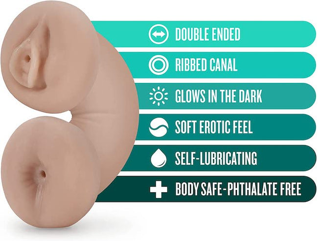 The M for Men Double Trouble Delight Glow stroker is loaded with fun! This pocket stroker is self-lubricating, just add a little water or saliva and everything gets slippery. Plus it glows in the dark - easy to see at night, alone or with a partner! The Double Trouble Delight has 2 ends to penetrate, with an easy-to-hold design.