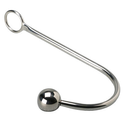 This impressive steel hook can be hooked up to ropes and other bondage equipment, making sure it keeps a strong hold on its wearer. There's 5" of insertable length (the ball and a portion of the hook). The hook then rests against the back, while the ring (1.5" in diameter) is used to connect to ropes.