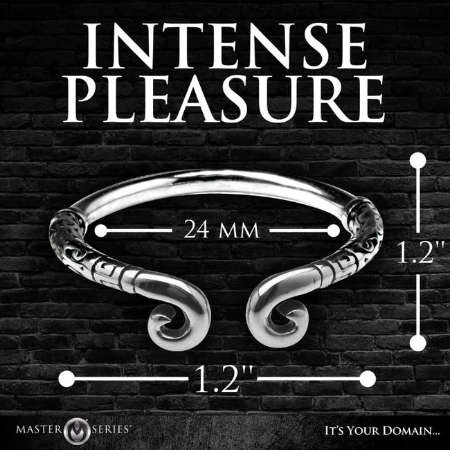 Indulge in heightened sensations and an upgrade to your look with this Kingpin glans ring! The gorgeous design includes whorls of patterns along the ring and curled ends. You're choosing quality when you choose stainless steel that is nickel-free, temperature sensitive, and strong enough to last. The pressure on the head of your shaft will make your head hard and sensitive, enhancing all feeling while you experience pleasure with or without a partner. Your partner will also enjoy the sensation of the ring on the head of your shaft, as well as the improved look! The ring even has an open closure so you can slightly adjust the tightness! To clean, simply wash with mild soap and water. Do not use it during anal play or you risk losing the ring.