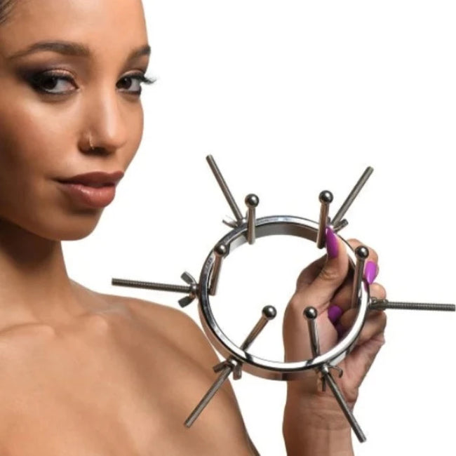The ring is wide enough for you to fit your fist through, as well! Each dilator rod can be adjusted individually using the wingnuts to tighten or loosen the position on the screw. Only the smooth steel will be pressing against the sensitive tissue of the anus while the spiraling screws are outside against the buttocks. To clean after use, rinse with warm water and mild soap or boil it in water. Then spray it with isopropyl alcohol and wipe clean. Grab plenty of your favorite lube and prepare the Anal Explorer by rubbing the round ball ends and rods with it.