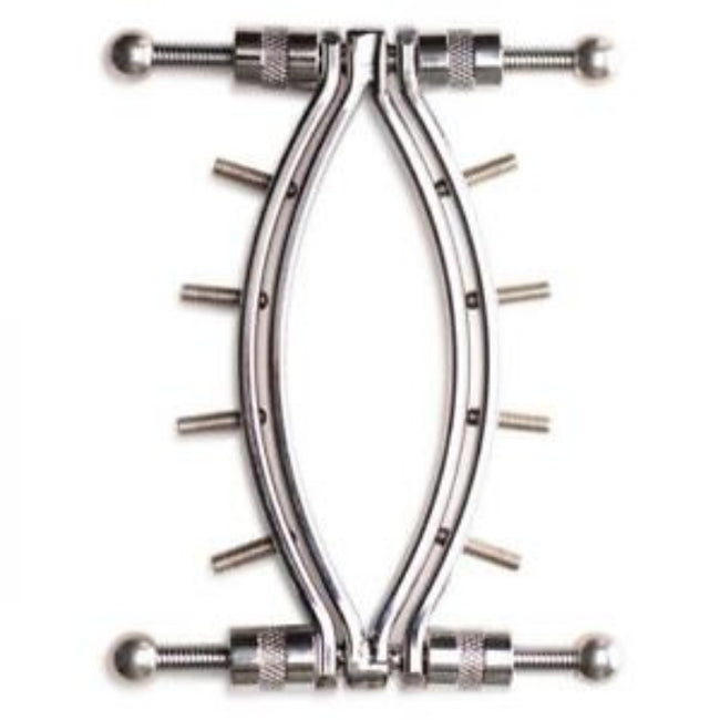 Spread her lips wide with this Spread 'Em Poker Labia Clamp! The clamps are made of durable, nickel-free, stainless steel. Feel free to use any lubricant with them and to cleanse them with boiling water and cleaning solutions between uses without harming the device. At the top and bottom are two compression screws that you can twist to close the clamps against the labia and cause the vulva to be on display. Along each side of the clamps are rows of 4 pinch screws -also known as pressure screws- that poke into the tender tissue of the labia.