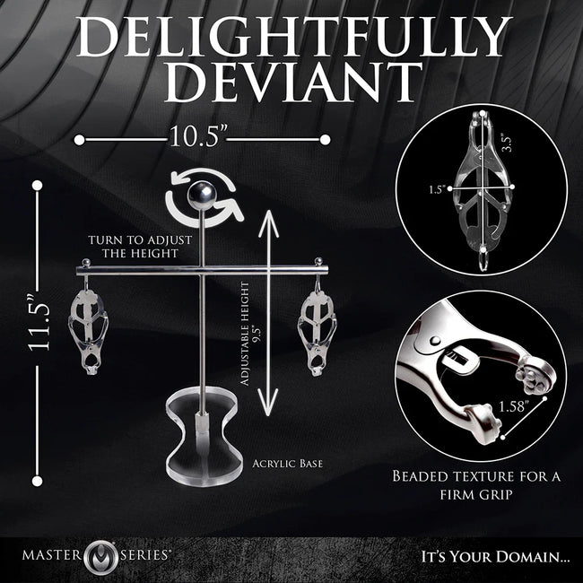 Put your submissive in a predicament pose they cant' escape with this Tower of Pain! This tower has clover-style nipple-clamps that increase in pressure when they're pulled on. The rubber tips protect the skin of the nipples and areola, but the pressure is wicked! The tower also adjusts in height so you can find the perfect height to torment them with!