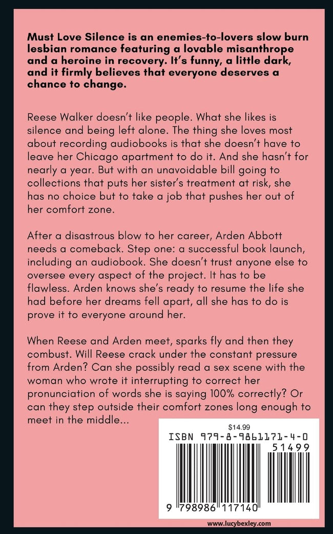Must Love Silence is an enemies-to-lovers slow burn workplace lesbian romance featuring a lovable misanthrope and a heroine in recovery. It’s funny and a little dark, and it firmly believes that everyone deserves a chance to change.