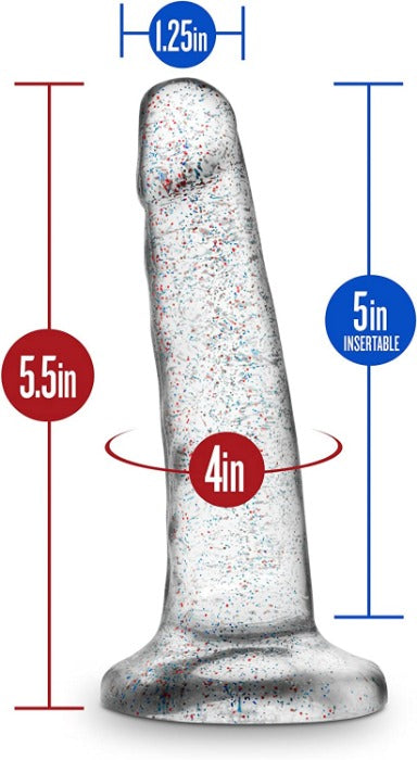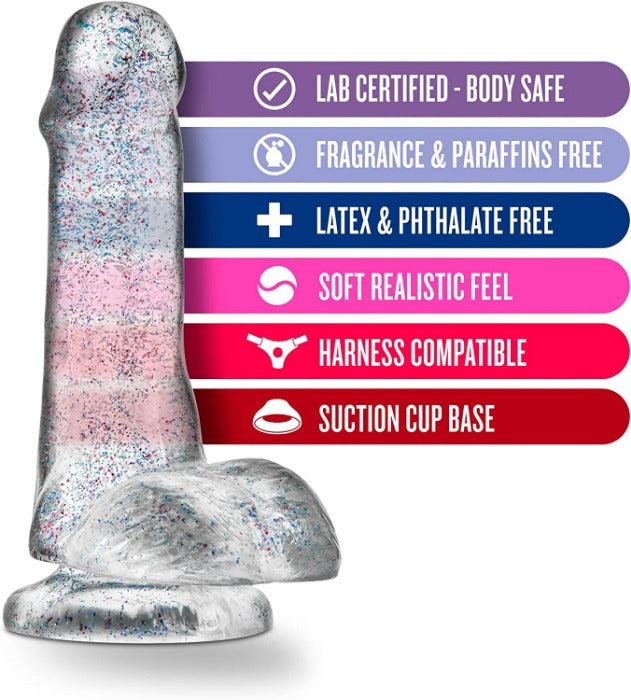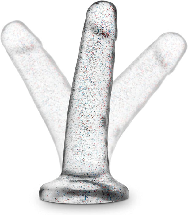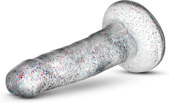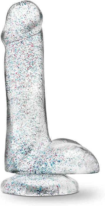 The naturally yours 6 inch glitter dong is not another boring dildo. It's crystal-like shimmering shaft looks adorable and pretty. The glitter dong 's 5 inches of soft insertable shaft fills you up comfortably. It's the perfect body safe sex toy for foreplay, as a sex toy for make fantasy threesome sex or a non vibrating masturbation toy. Whatever your pleasure the glitter dong is there for you. The 6 inch glitter dong is made from body safe TPE that contains no phthalates, latex, parrafins or anything else that is not safe for your body.