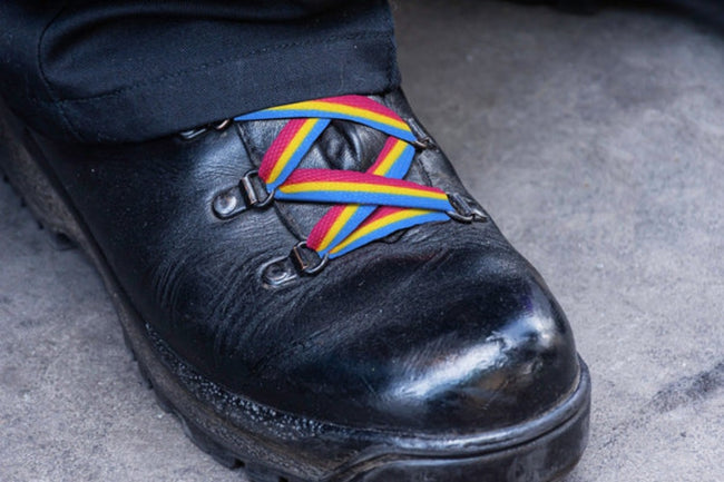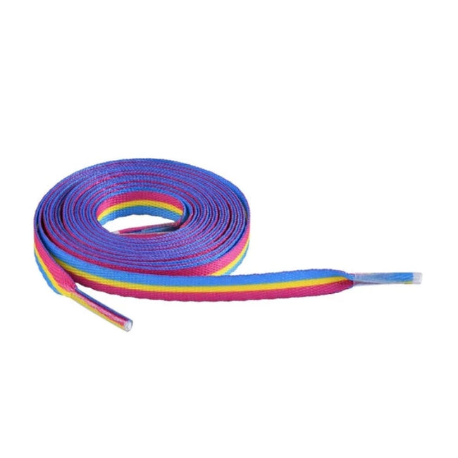 These pansexual flag striped shoelaces are striped with the colors of the pansexual flag. Great to wear for a pride parade or other outdoor pride awareness event. The shoelaces are 56 inches long and a bit more than 1/4 inch wide. Each pair comes coiled and is individually wrapped.