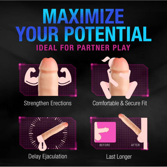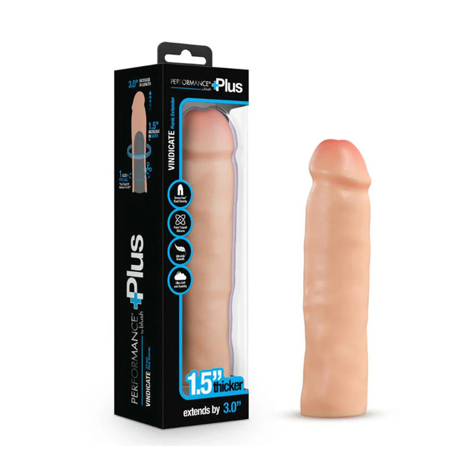 Maximize your potential with the Performance Plus Vindicate Penis Extender by Blush. Designed for those who demand perfection, this 8.5-inch extender enhances both length and girth, adding an impressive 3 inches in length and 1.5 inches in girth for a more commanding presence. Vindicate is crafted from Sensa Feel® Dual Density Silicone, providing a realistic, lifelike touch that’s soft on the outside and firm on the inside.