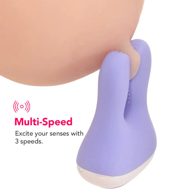 As one or both of these sweet little non-adjustable silicone pinchers grip your (or someone else's) nipples, you can add even more sensation with three speeds and one pulse mode of vibration. Hit a button at the base to activate. Pro tip: wear one and use the other to please a partner.