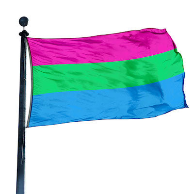 The polysexual flag has three stripes, pink representing attraction to women, green representing attraction to non-binary people, and blue representing attraction to men.