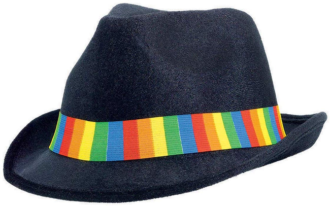 Wear Your Pride! with this Black Velour Fedora Hat with Rainbow-Striped Hatband. This fun fedora features a classic black felt fedora design with a rainbow band running around the crown of the hat. Perfect to use for parties, parades and more! One size fits most.
