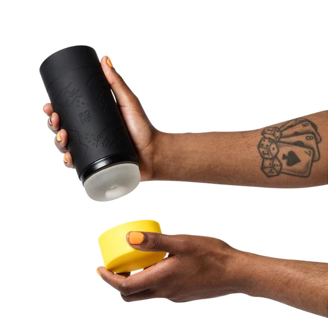 Feel the satisfying pleasure of a partner, even when you are alone with the ROMP Dash male stroker! This body safe silicone stroker has a textured love channel so when you slip inside, you are stimulated by every bump, contour, and ridge. With Dash, you control how much this toy sucks! After applying a generous amount of water-based lube to your toy, slide inside and remove the black cap. Place it back on completely to create a snug suction around your penis.