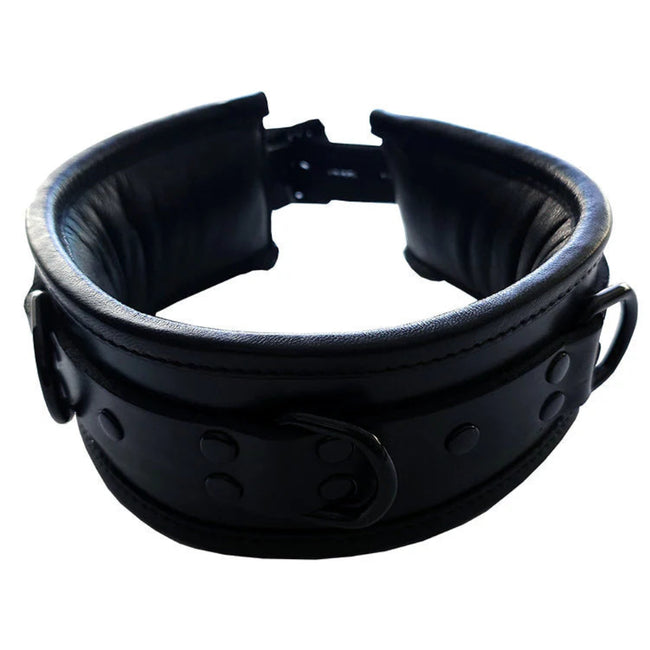 Leather padded collar made of premium leather. This collar is adjustable for the perfect fit. Has three D-Rings allowing for attachments. All black with black Accessories.