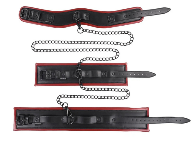 Strap them in, things are about to get hot. Enhance your next scene with the Saffron Chained & Tamed, expertly designed to keep your partner at your mercy. Use all the pieces together or interchangeably for optimum positioning. Begin your next session with the posture collar for added control. Then add the double wrist cuff to lock their hands together and the double ankle cuff to keep them in place. Next, connect the cuffs and collars how you see fit and exude your power over them.