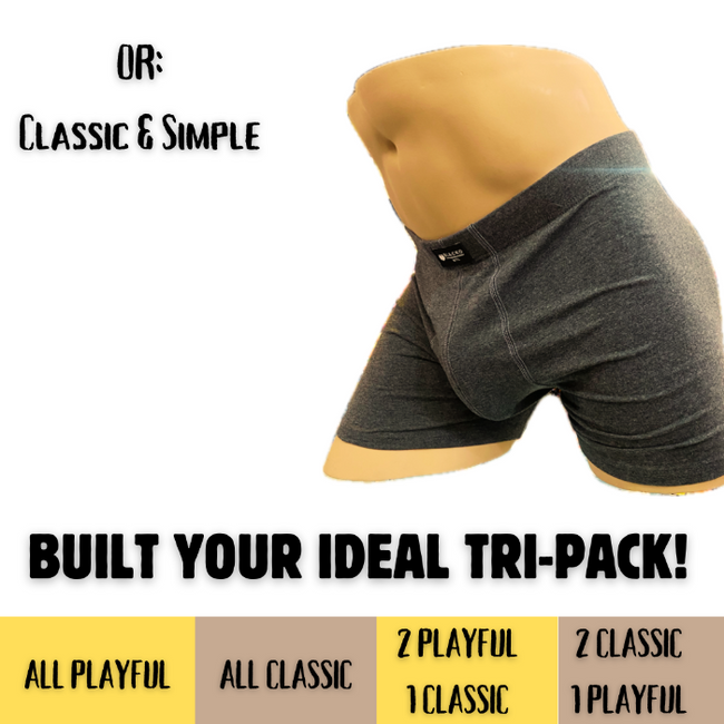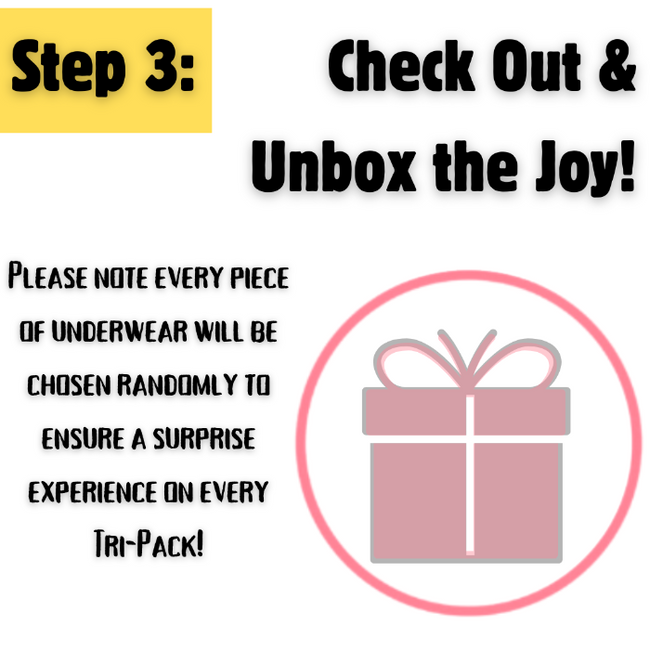 Choose Your Combination: Decide between classic/plain or patterns/playful designs to curate your personalized selection. Please note every piece of underwear will be chosen randomly to ensure a surprise experience on every Tri-Pack.