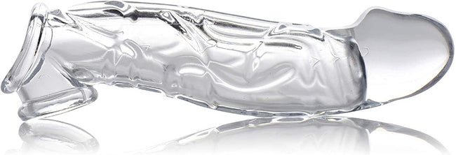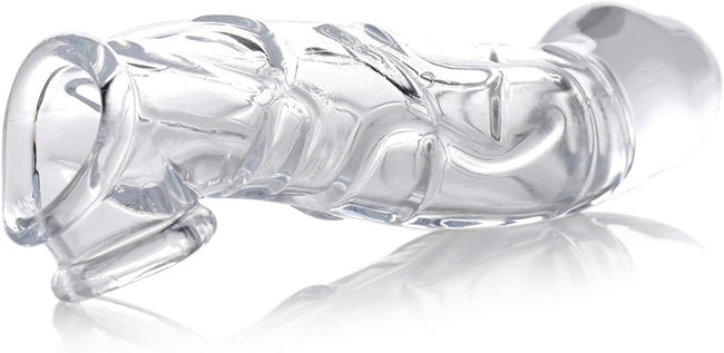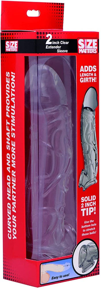 This extender sleeve gives you two whole inches of solid penis to plow into your partner! The realistic texture, featuring a bulbous head and bulging veins, along with a subtle curved shape will deliver a new kind of internal massage. Just lube up and put your entire package through the first hole, allowing your scrotum to go through the bottom hole for a satisfying stretch. The solid 2 inch tip is followed by a hollow interior that allows for a snug and secure fit. This body-safe and phthalate-free material is compatible with silicone and water-based lubricants. Use warm water and mild soap or a toy cleaner to clean after use.