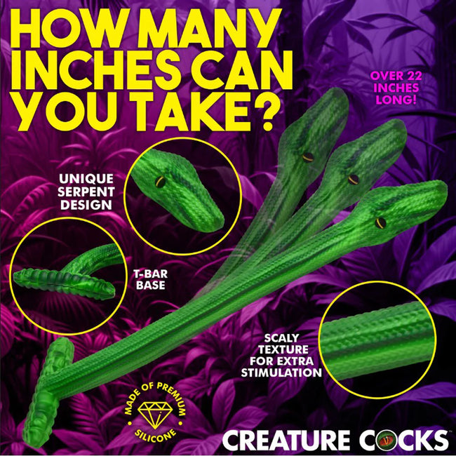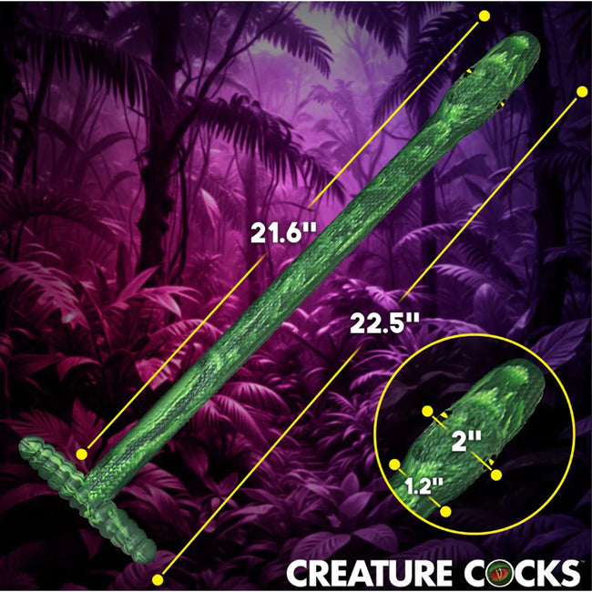 Discover untamed pleasure with the Slither Silicone Dildo! This striking bright green serpent invites you to explore the depths of your own wilderness! The unique design features a round, tapered nose and a bulging head, leading to a long, textured body for constant stimulation as you encourage the snake to slither in deeper. The ridged, easy-grip handle forms a T-shape at the base, enhancing safety and control during use and creating a stopping point in your adventures that works better than a flanged base.