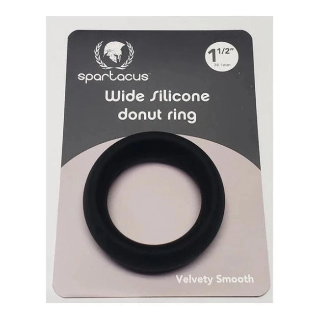 Wide Silicone Donut Ring Black 1.5 inches from Spartacus. Embrace the world of enhanced pleasure with the Wide Silicone C-Ring. Designed to be worn on the penis, these rings heighten the pleasure for men by promoting a firmer erection and more intense orgasms. Experience an elevated intimate experience with these stylish and functional accessories. Made from high quality Silicone, these wide Cock Rings are soft, velvety, and comfortable, providing a secure yet gentle fit.
