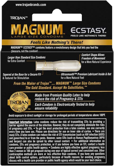 - Magnum ecstasy lubricated condoms from Trojan feature a revolutionary design that lets you feel the pleasure not the condom