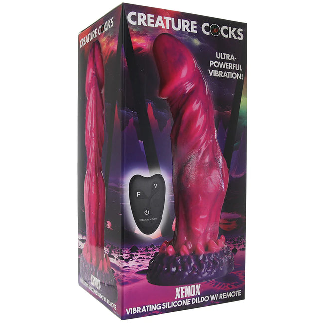 In pure, hypoallergenic silicone, the Xenox is body-safe and easy to clean and care for. Wash it with soapy water or a favorite toy care fluid/foam before and after. Feel free to use any water-based lube you love with your Creature Cock, but please keep it away from silicone-based lubes and other silicone toys/products. The rechargeable Xenox is splash-proof but shouldn't be submerged. USB charge cord included. The remote takes 1 23A battery, which is also included.