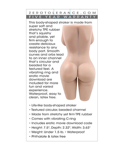 This body-shaped stroker is made from super soft and stretchy TPE rubber that’s squishy and pliable, yet firm enough to create delicious resistance to any body part. Smooth curves and orbs lead to an inner channel that’s circular and beaded for a textured feel. A vibrating ring and erotic movie download are included for more fun and varied experience. Waterproof, easy to clean, latex free.