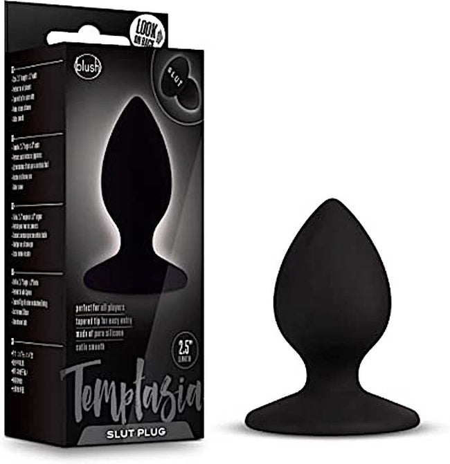 Show them what you really are... The Temptasia Slut Plug is an expressive anal toy made from satin-smooth silicone. Featuring a tapered tip for easy insertion, this Temptasia plug is ideal for new to intermediate-level anal players. The round base sports the word "SLUT," painted in the platinum cured silicone. It's body safe and simple to clean!