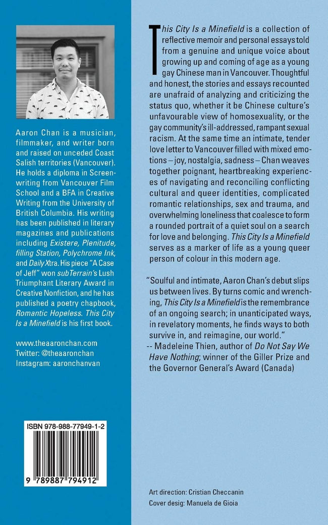 This City is a Minefield is a collection of reflective memoir and personal essays told from a genuine and unique voice about growing up and coming of age as a young gay Chinese man in Vancouver. Thoughtful and honest, the stories and essays recounted are unafraid of analyzing and criticizing the status quo, whether it be Chinese culture's unfavourable view of homosexuality, or the gay community's ill-addressed, rampant sexual racism. At the same time an intimate, tender love letter to Vancouver filled with mixed emotions—joy, nostalgia, sadness—Chan weaves together poignant, heartbreaking experiences of navigating and reconciling conflicting cultural and queer identities, complicated romantic relationships, sex and trauma, and overwhelming loneliness that coalesce to form a rounded portrait of a quiet soul on a search for love and belonging. This City is a Minefield serves as a marker of life as a young queer person of colour in this modern age.
