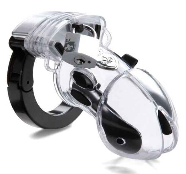 The Pubic Enemy No 1 is our neat and transparent cock cage with e-stim function: He lets you keep a boisterous willy pent up under lock and key so that he can't get stiff until the mistress, or the master, comes with the key and lets him out. With the conducting surfaces, left and right, the prisoner can be treated to your heart's content with tingles, twitches or pulsations in precisely the intensity he deserves.