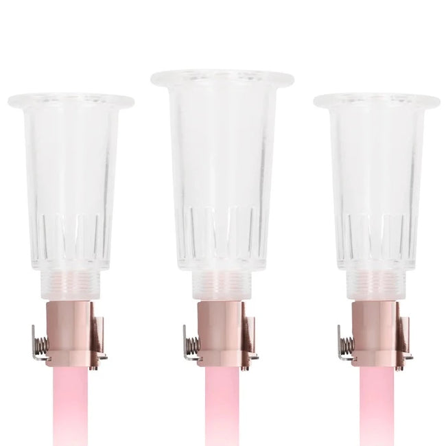 In extra sturdy acrylic, the Rose Gold Clitoral & Nipple Pump Set's three suction cups offer two smaller (2.6"/6.8cm x .7"/1.9cm) cups for your/their nipples and one larger (3.1"/7.9cm x .9"/2.5cm) for the clit, all featuring wide circular openings capable of fully surrounding sweet spots. The cups are strategically crystal clear and 100% voyeur friendly - you'll both be able to watch as suction takes hold.