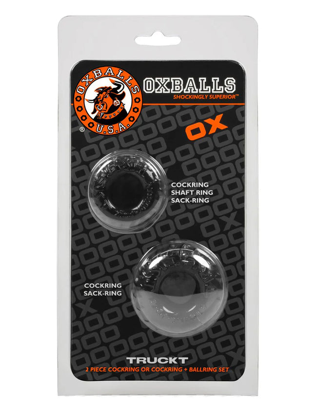 TRUCKT cockrings hugs your meat with 2 different fits--the large one for a good grip on your cock & balls and a good hard bone, the smaller one if you want more grip for rock-hard meat…or wrap your cock & balls with the large ring, and use the smaller ring stretched around your ballsack for tons of grip.