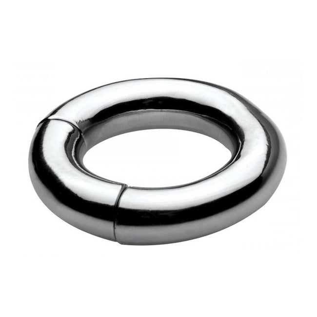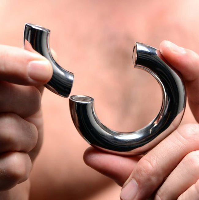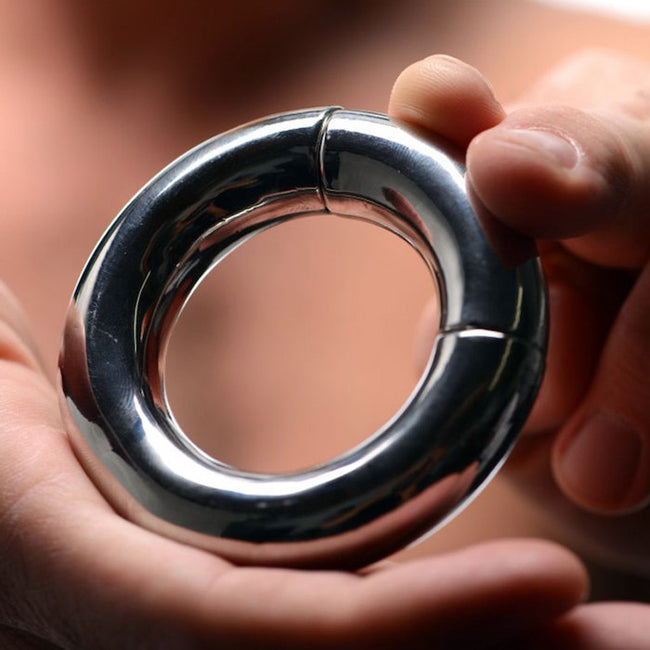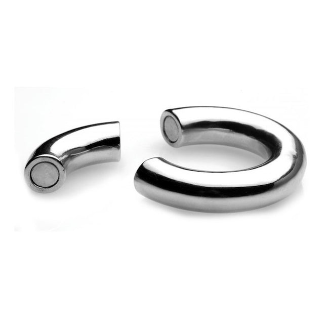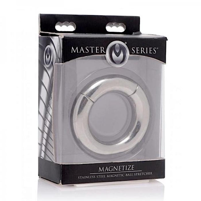 The Master Series "Magnetize" Stainless Steel Ball Stretcher Weighs in at a whopping 7.5 oz, this ball-stretcher will get the job done simply with the sheer force of gravity! Made of highly durable stainless steel, this heavy ring will pull down on your scrotum to create a unique sensation that will amplify a sexual experience on your own or with a partner. The powerful magnetism within the ring allows it to easily open and securely close.