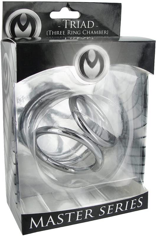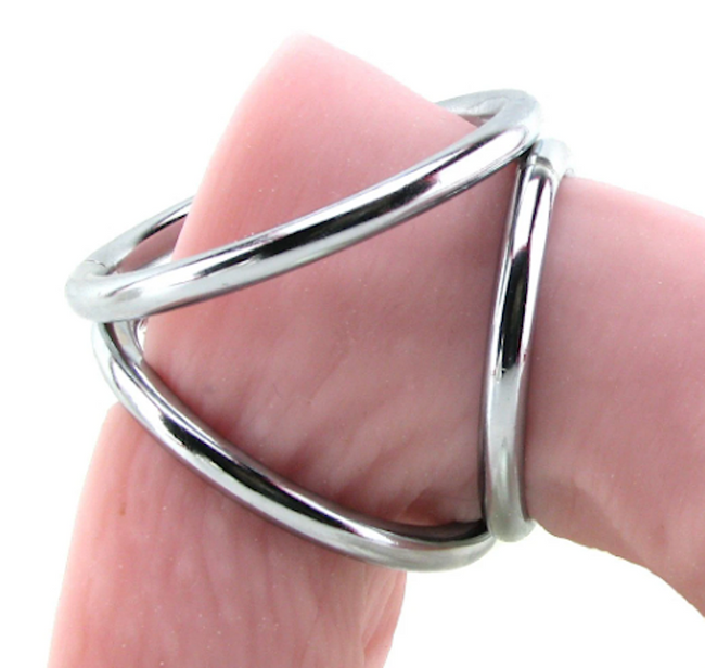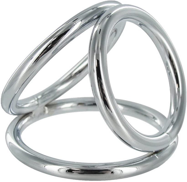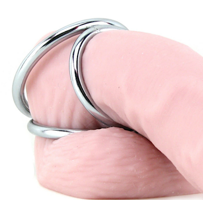 The larger of the rings fits over the shaft and balls, up against the body, while the mid-sized number loops under the testicles, leaving the smallest to fit over the shaft. In combination, the three join forces to support, constrict and control sensation in a way that perhaps no other cock ring can. Needless to say, the steel is definitely unyielding and will stand up to some very enthusiastic handling.